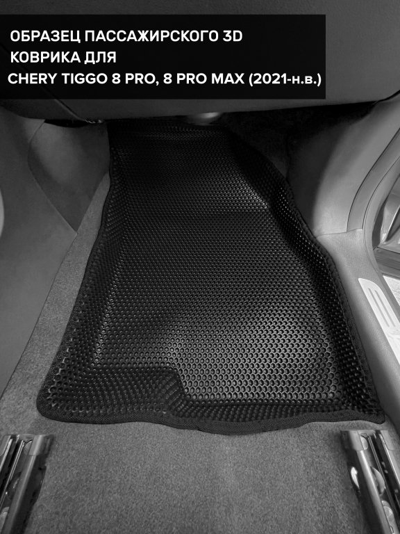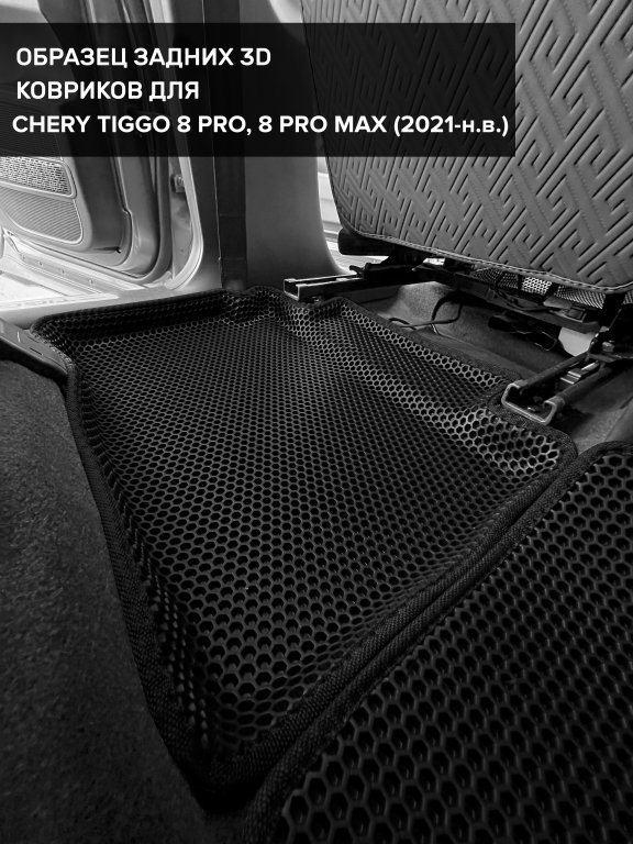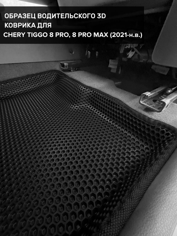 Автомобильные 3д коврики для Chery Tiggo 8 Pro (2021-н.в.) в салон авто и багажник сделаны из инновационного полимерного материала EVA, изысканная структура в виде ячеек не дает воде, пыли и снегу разлетаться по салону машины и багажнику. 3д коврики зафиксированы на полу определенными клипсами, соответствующими Chery Tiggo 8 Pro (2021-н.в.), и не двигаются в процессе езды.