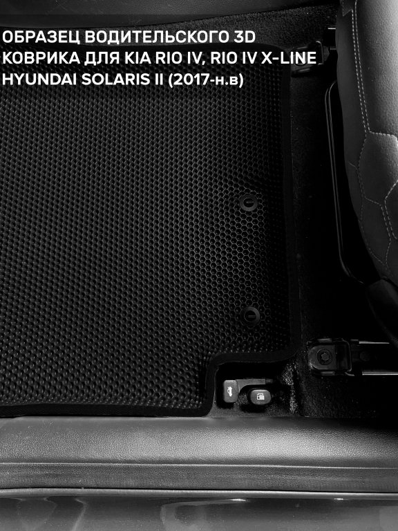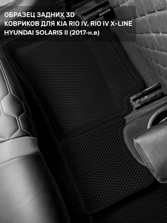 Автомобильные 3д коврики для Kia Rio IV (2017-н.в.) в салон авто и багажник сделаны из инновационного полимерного материала EVA, изысканная структура в виде ячеек не дает воде, пыли и снегу разлетаться по салону машины и багажнику. 3д коврики зафиксированы на полу определенными клипсами, соответствующими Kia Rio IV (2017-н.в.), и не двигаются в процессе езды.