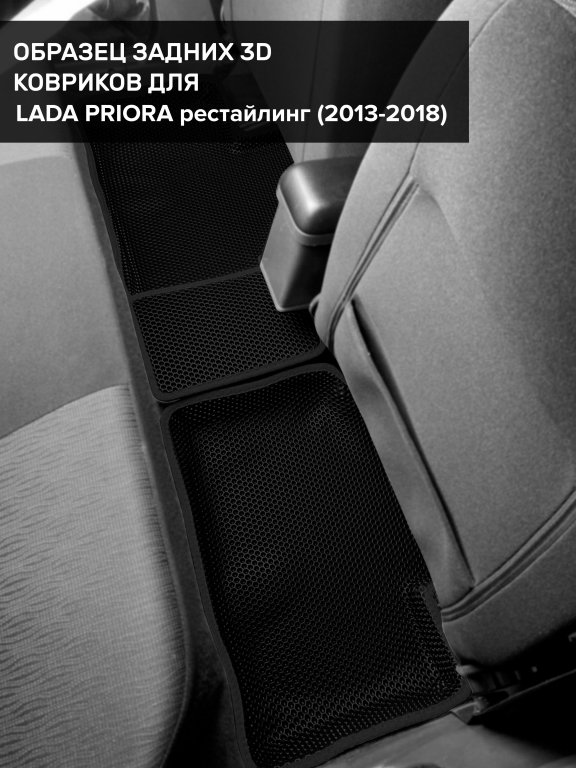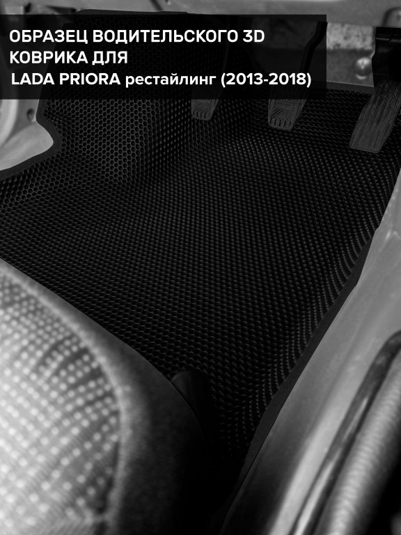 Автомобильные 3д коврики для Lada Priora рестайлинг (2013-2018) в салон авто и багажник сделаны из инновационного полимерного материала EVA, изысканная структура в виде ячеек не дает воде, пыли и снегу разлетаться по салону машины и багажнику. 3д коврики зафиксированы на полу определенными клипсами, соответствующими Lada Priora рестайлинг (2013-2018), и не двигаются в процессе езды.